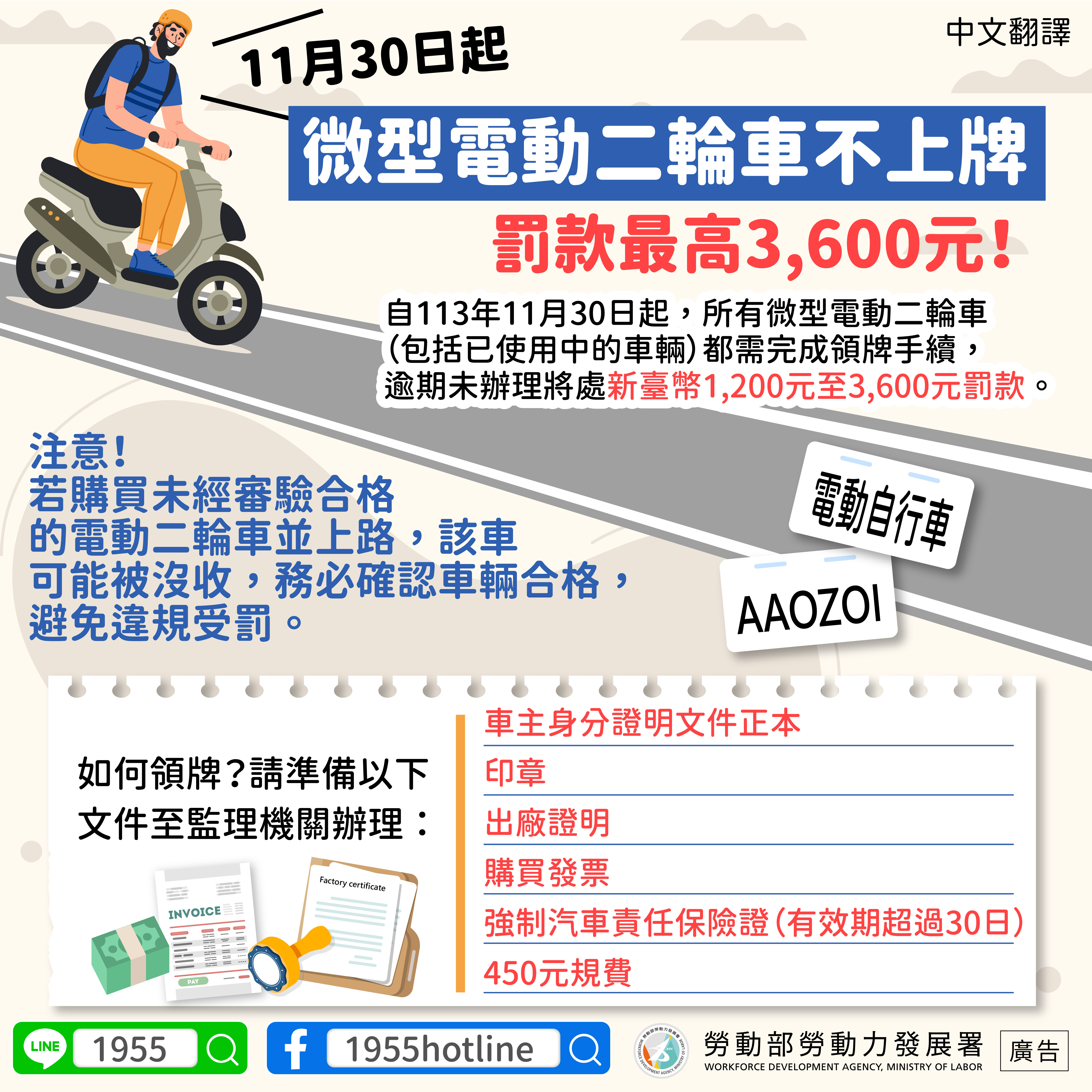 LINE@移點通-【113年11月30日起,微型電動二輪車不上牌,罰款最高3,600元!】-多國語言版